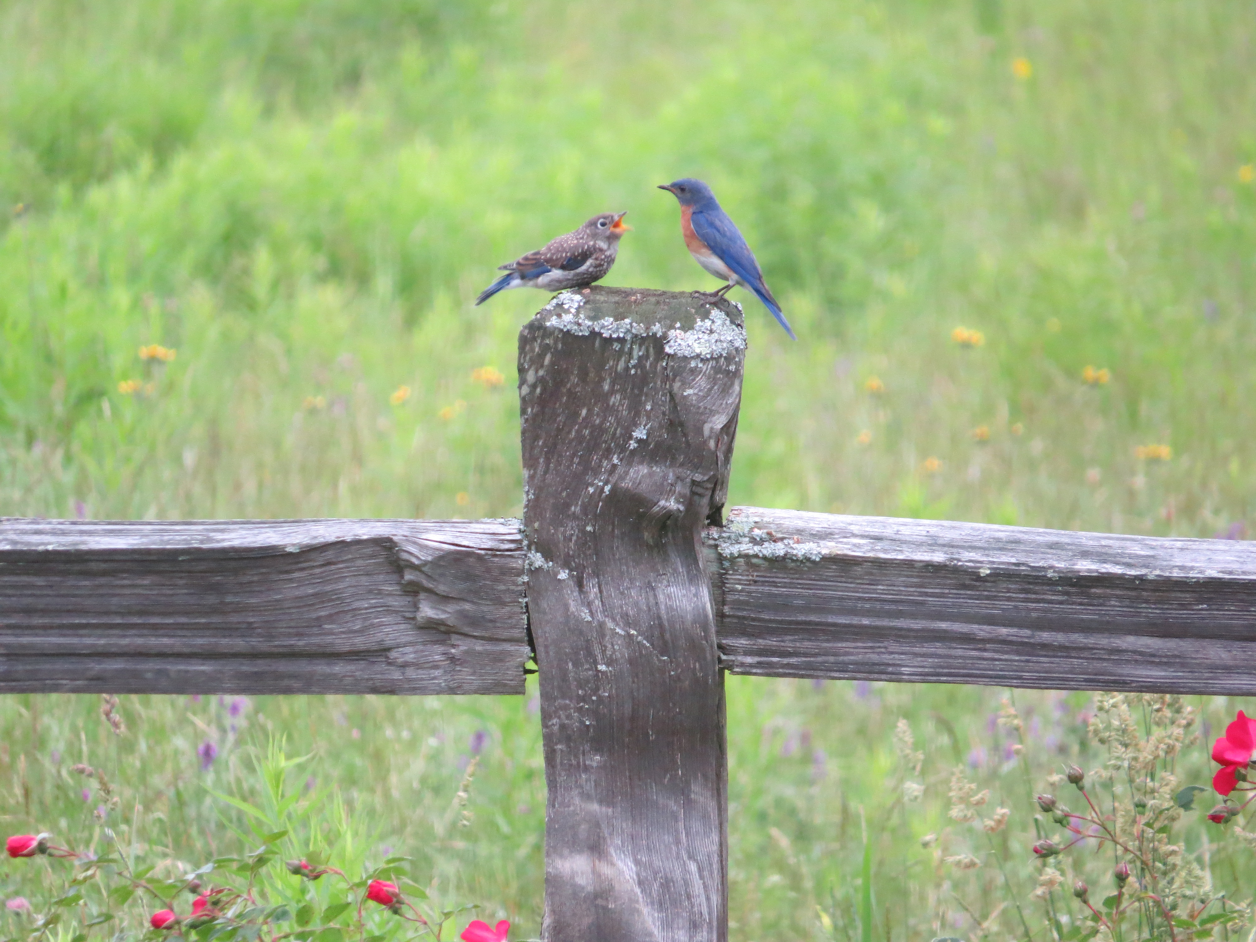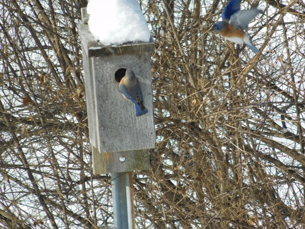 Deb McWethy of Harrisville, N.H. sent in this photo of an Eastern Bluebird pair on a nesting box in mid-November, late for a sighting.