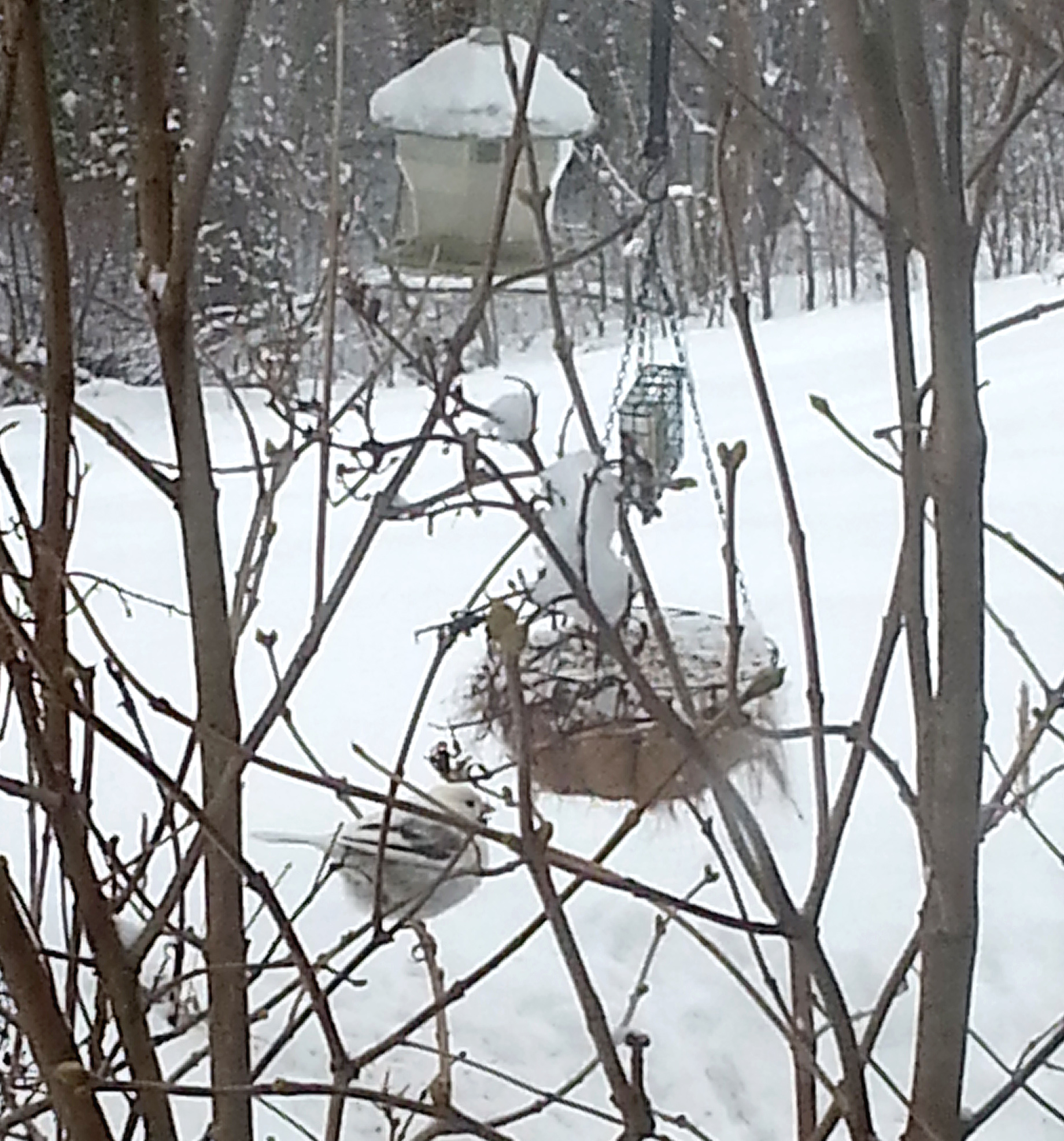 – L.S. of West Chesterfield, N.H. grabbed this shot of a male Snow Bunting in breeding plumage in her backyard in Feb. 2015.