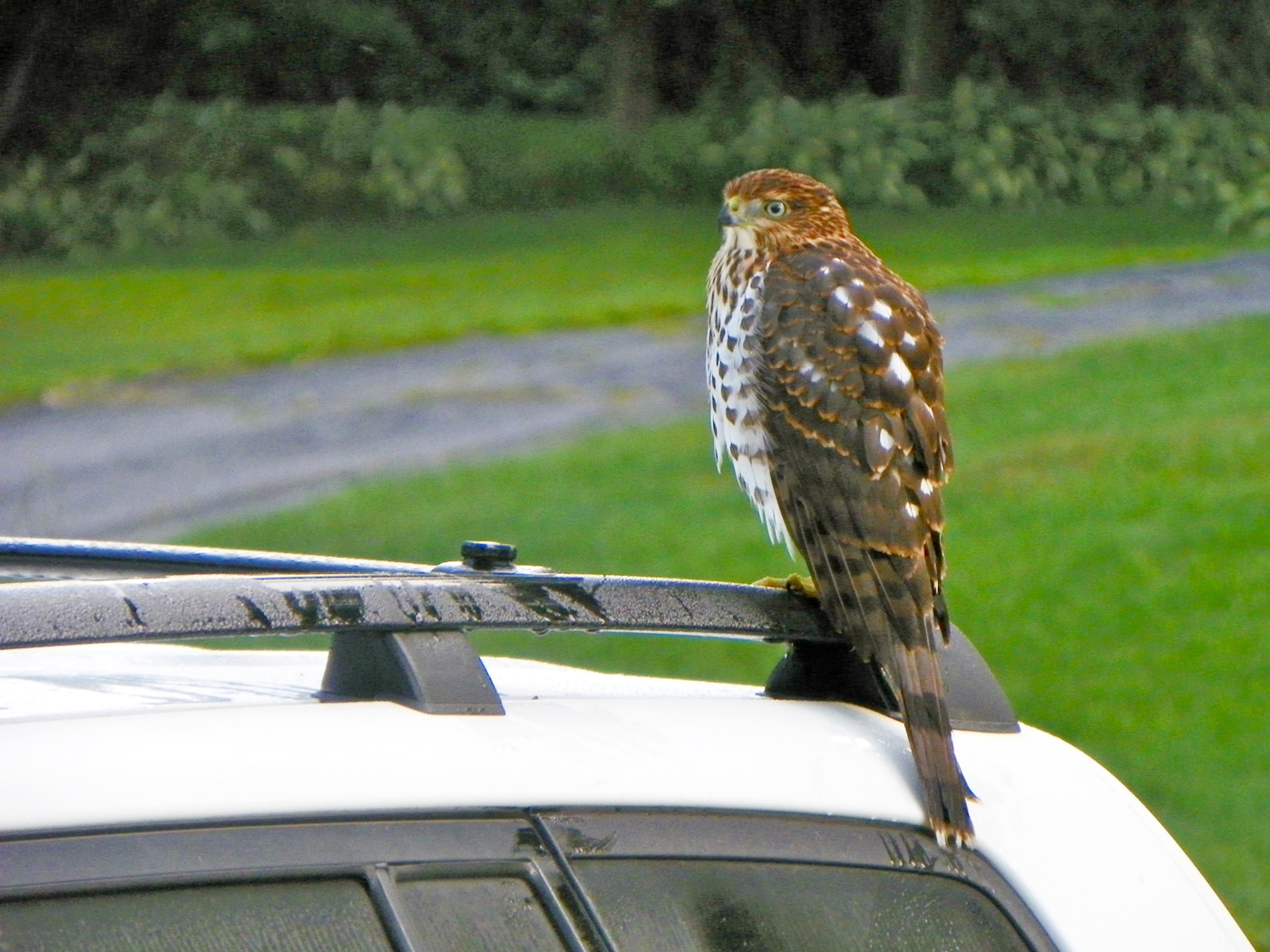 Mary Eccles of Norwalk, Conn., had this visitor waiting on her car in this August 2014 photograph. Not sure where the Cooper’s Hawk wanted to go.