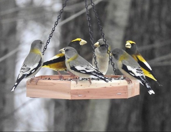 Mike Quinn of Ticonderoga, N.Y. had these evening grosbeaks visit recently (December 2025.)