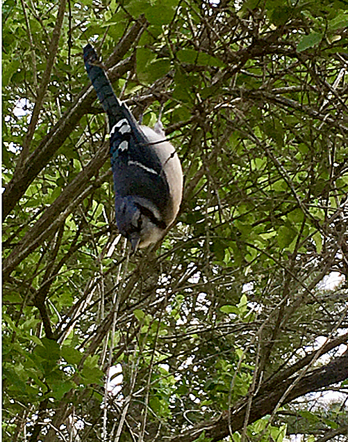 Roxanne Rubell of Swanzey, N.H., got this photo of a blue jay hanging upside down in a tree, spring 2020.