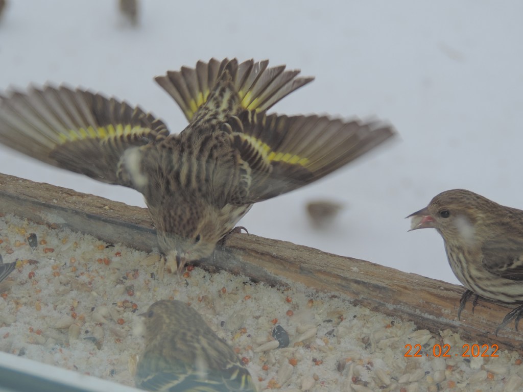 Andree from Quebec had a massive flock of pine siskins visit her home in Canada in February 2022.