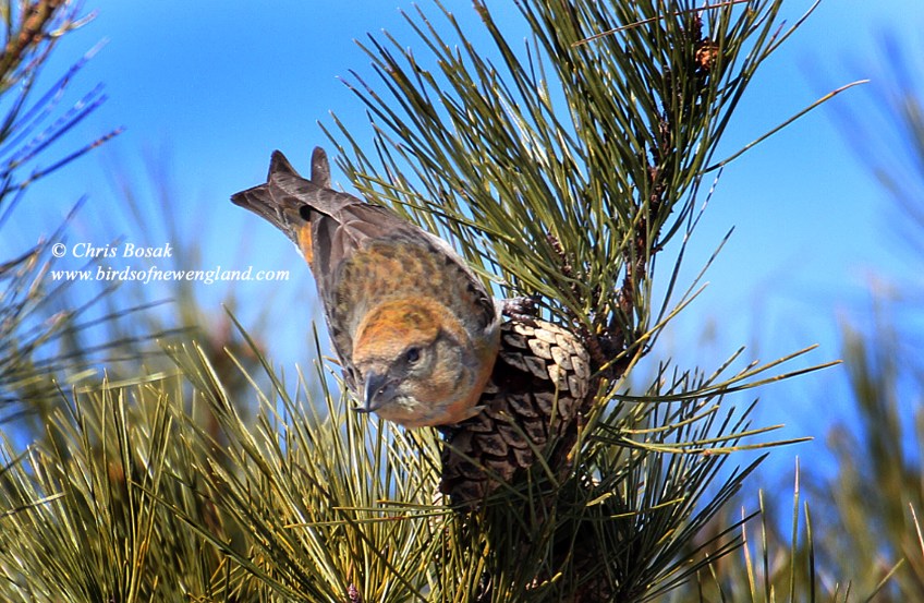 rw crosbill2c Published February 21, 2021 at 1600 × 1044 in rw crosbill2c Photo by Chris Bosak A red-winged crossbill eats seeds from a cone at Hammonasset State Park, February 2021.