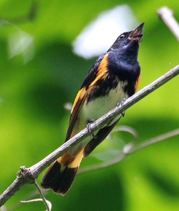 An American Redstart sings from a perch in Selleck’s and Dunlap Woods in Darien, Conn., May 2015.