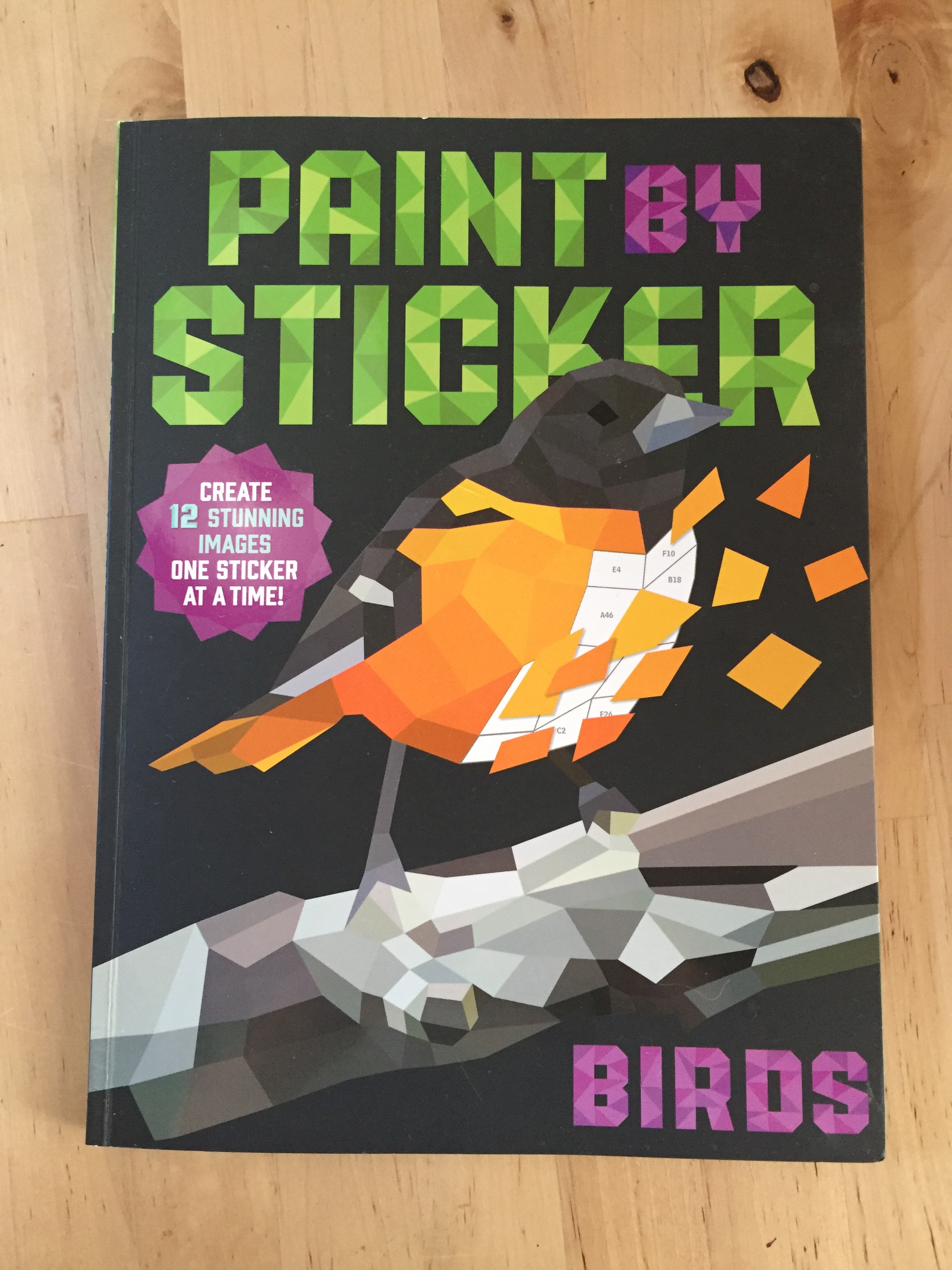 You’ve heard of color by number and paint by number, now the latest thing is Paint by Sticker. There is a birding option for Paint by Sticker from Workman Publishing and I received the book a few weeks ago. I admit I was a bit skeptical at first, but I really am enjoying the book. It is fun to see the work come together into a neat finished project.