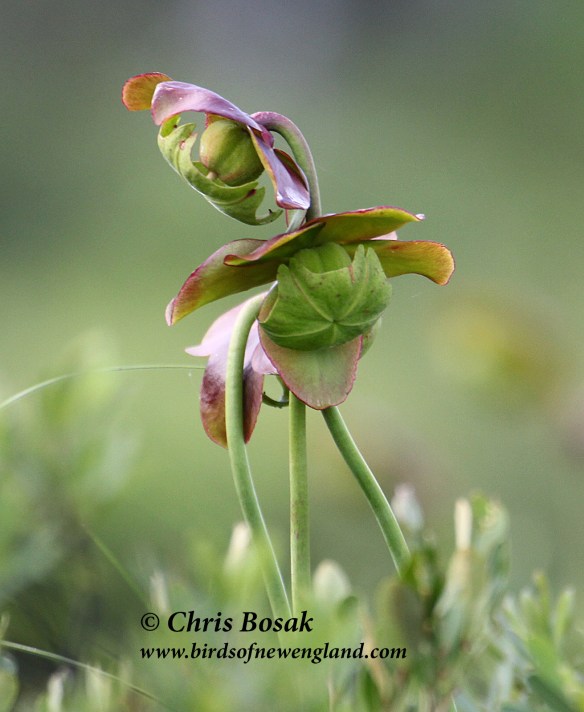 According to Massachusetts Audubon’s website, “Its vase-shaped leaves are 4-10 inches long. Peer inside one of these leaves and you’ll see a bacteria-laden soup. Insects fall into this fluid and are digested; they can’t escape because the walls are lined with downward-pointing hairs.”