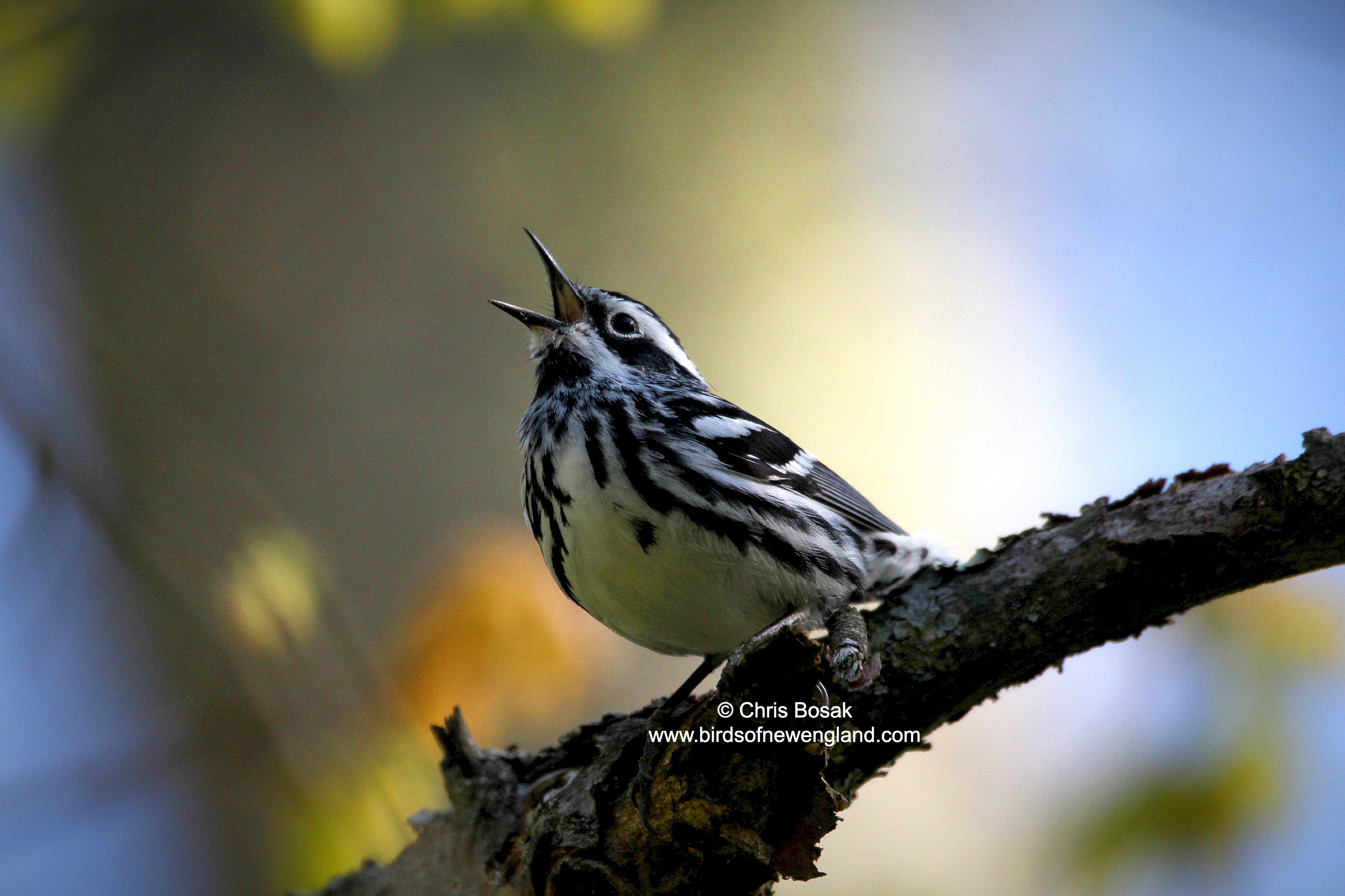 Photo by Chris Bosak – A black-and-white warbler sings in New England, spring 2025.