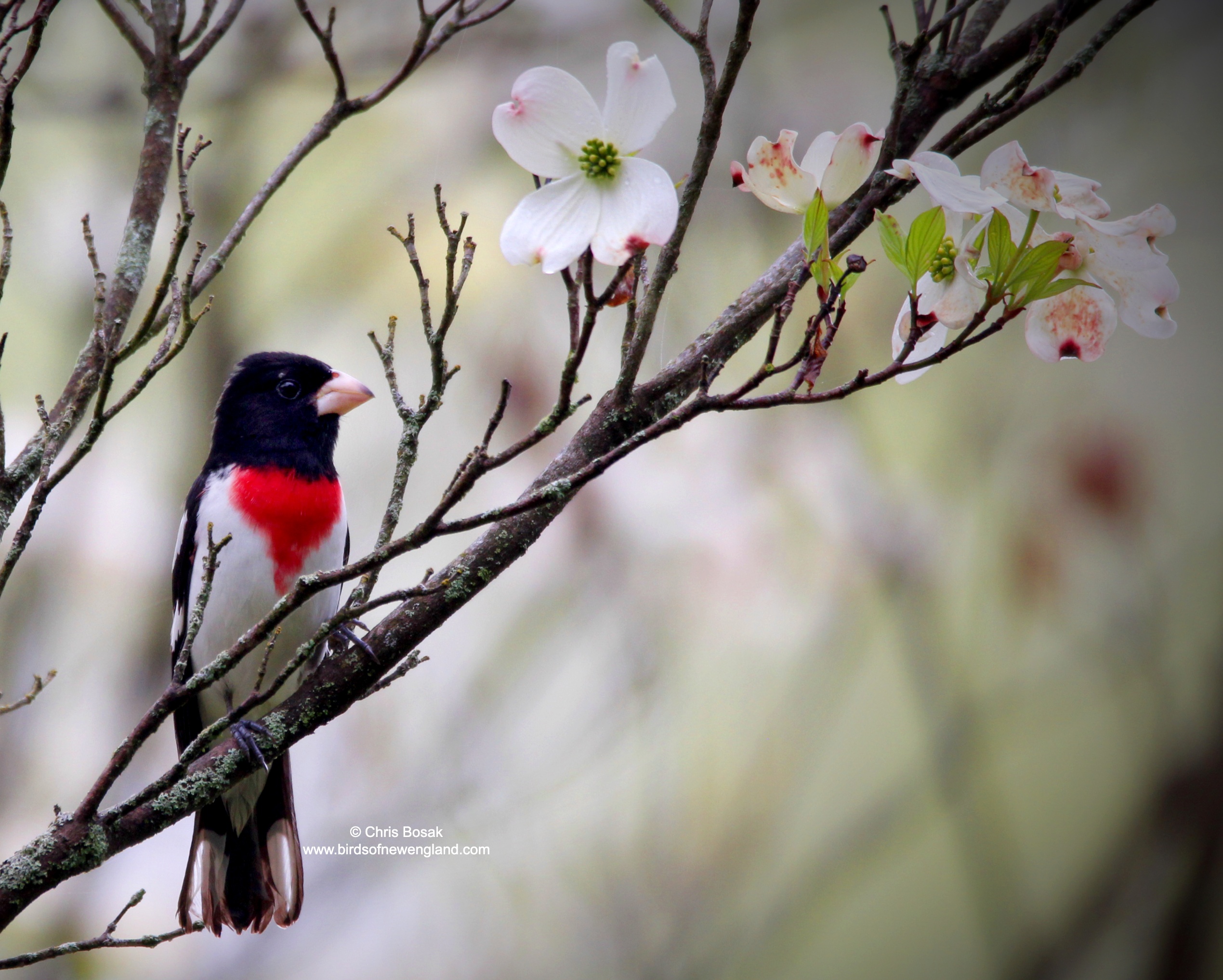 A rose-breasted grosbeak perches in a dogwood tree, New England, spring 2025.