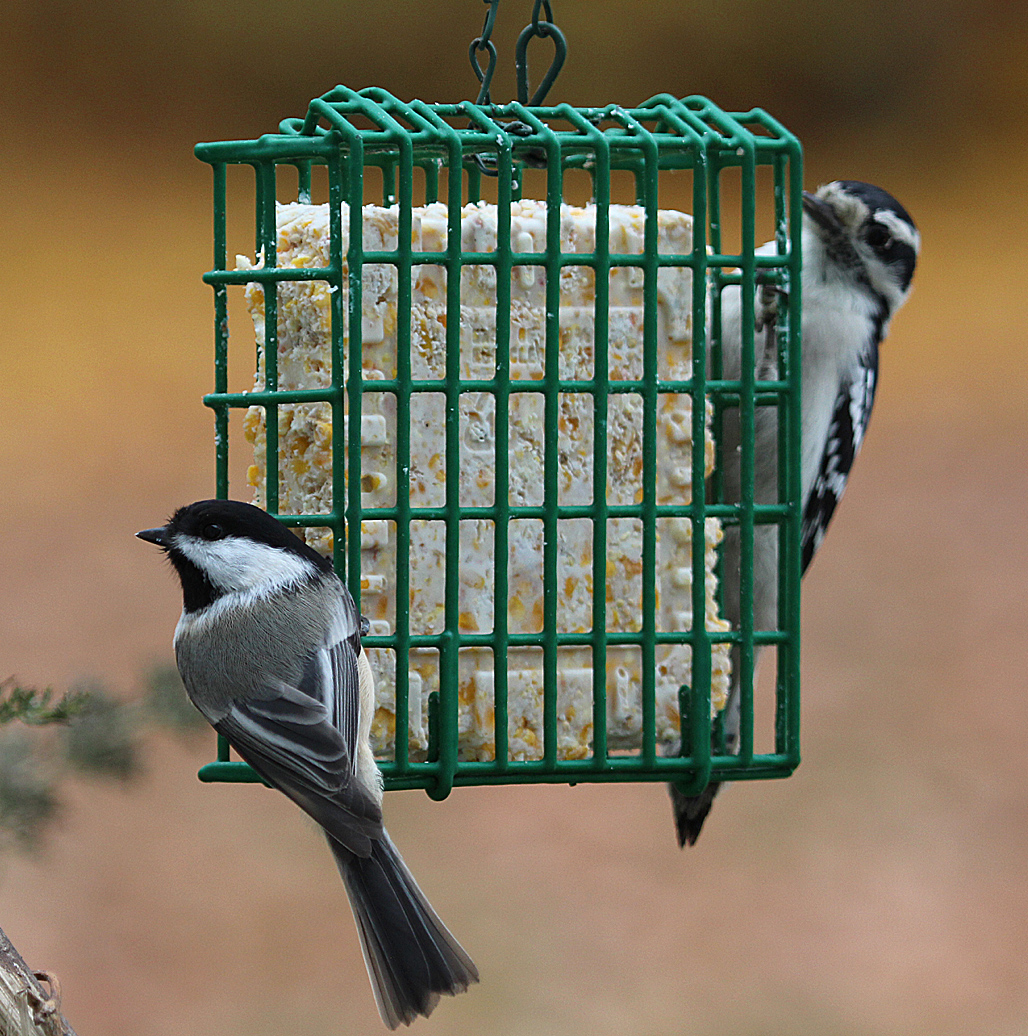 A Black-capped Chickadee and Downy Woodpecker share the suet feeder, Nov. 16, 2014.
