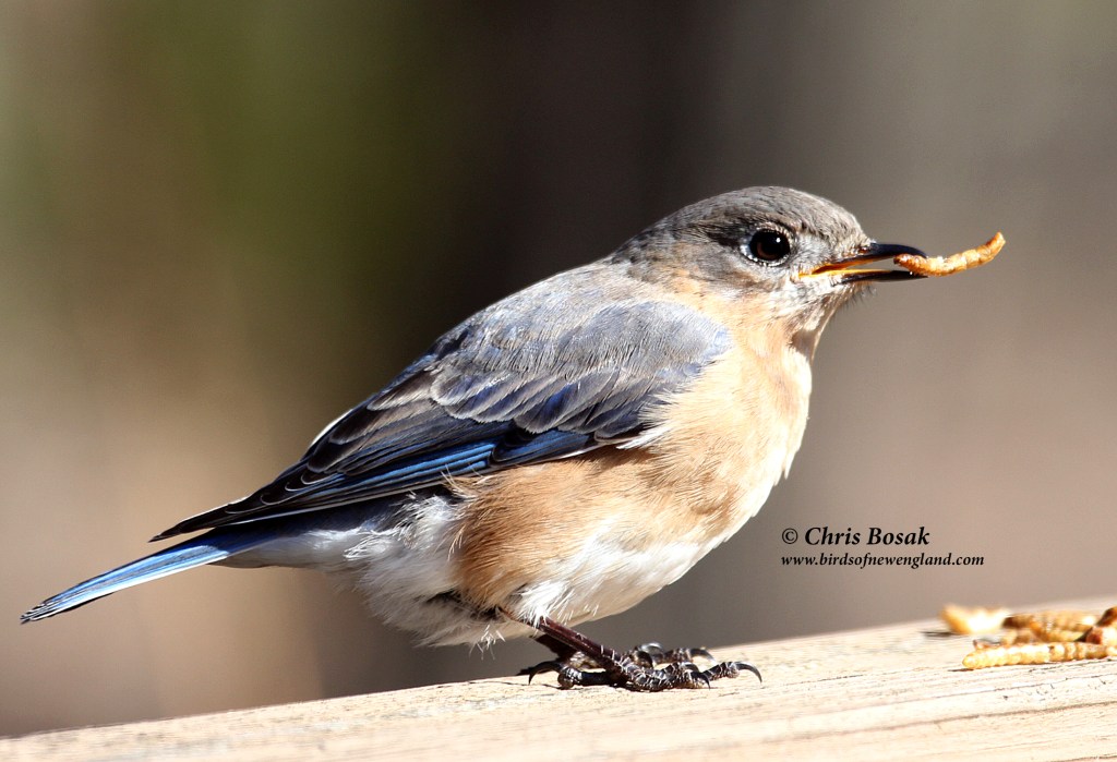 Photo by Chris Bosak An eastern bluebird visits a backyard feeder for mealworms in New England, Feb. 2020.Photo by Chris Bosak An eastern bluebird visits a backyard feeder for mealworms in New England, Feb. 2020.
