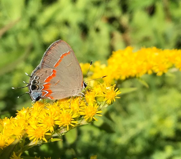 Armed with only my phone camera on a meadow walk with Savanna this morning, we came across this banded hairstreak, a tiny and handsome butterfly of New England.