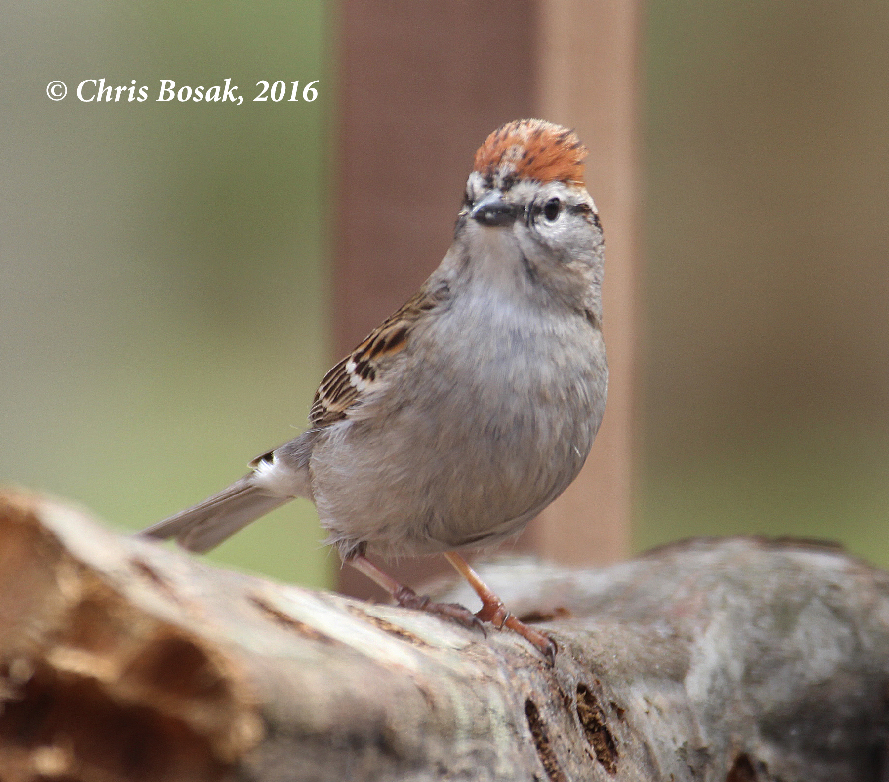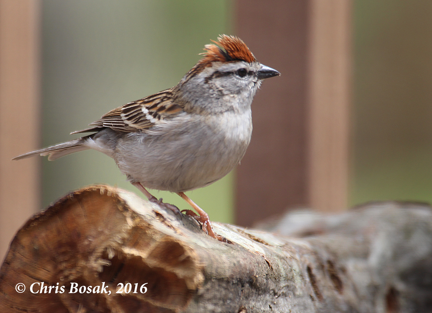 A Chipping Sparrow raises its crest while standing on a log in Danbury, Conn., summer2016.