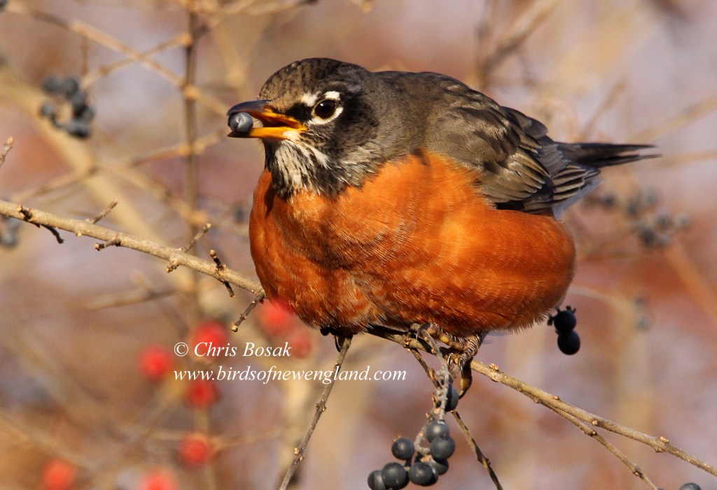 Winter birding also means seeing birds that may be unexpected in the cold months. American robins are known as harbingers of spring, but many stay with us all winter in New England. They may not be the same robins that nested with us in spring and summer, but rather ones that nested farther north and have come here for a “warm” winter. Robins tend to be seen in large flocks during the winter, particularly when there are berries to be had.