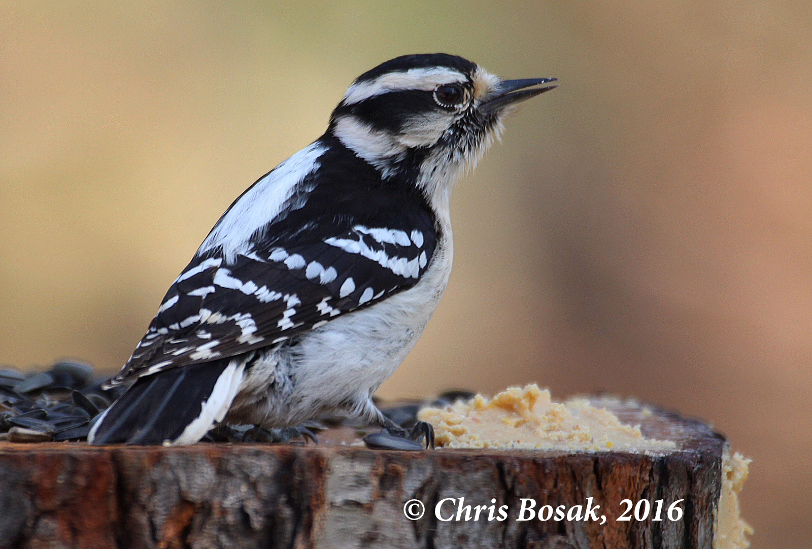 Photo by Chris Bosak A male Downy Woodpecker eats from a homemade platform feeder in Danbury, Conn., fall 2016.