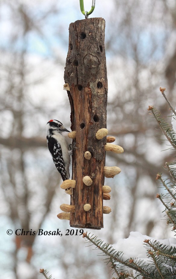 Here’s a downy woodpecker getting peanuts from the homemade feeder I mentioned in yesterday’s post.