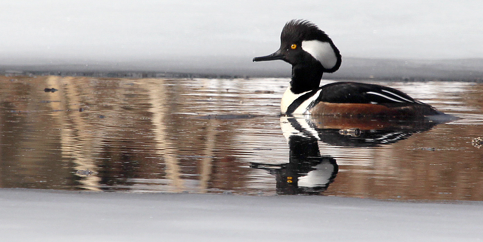 A flock of Hooded Mergansers swims past a Redhead at a Darien pond in March 2014.