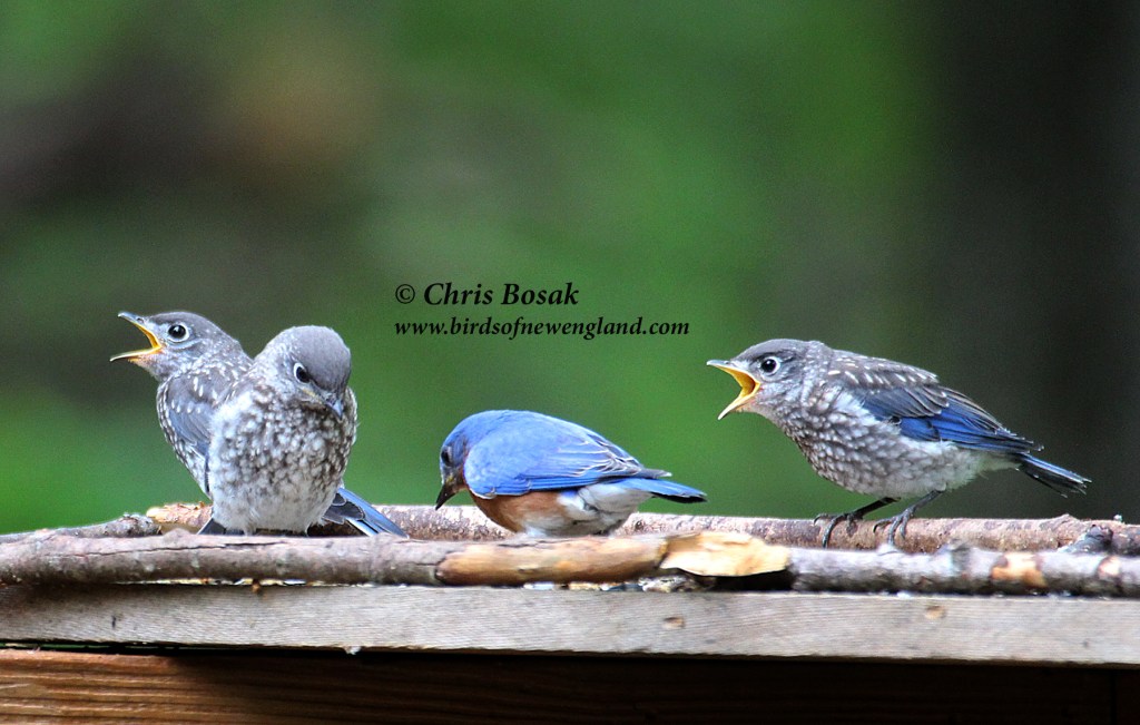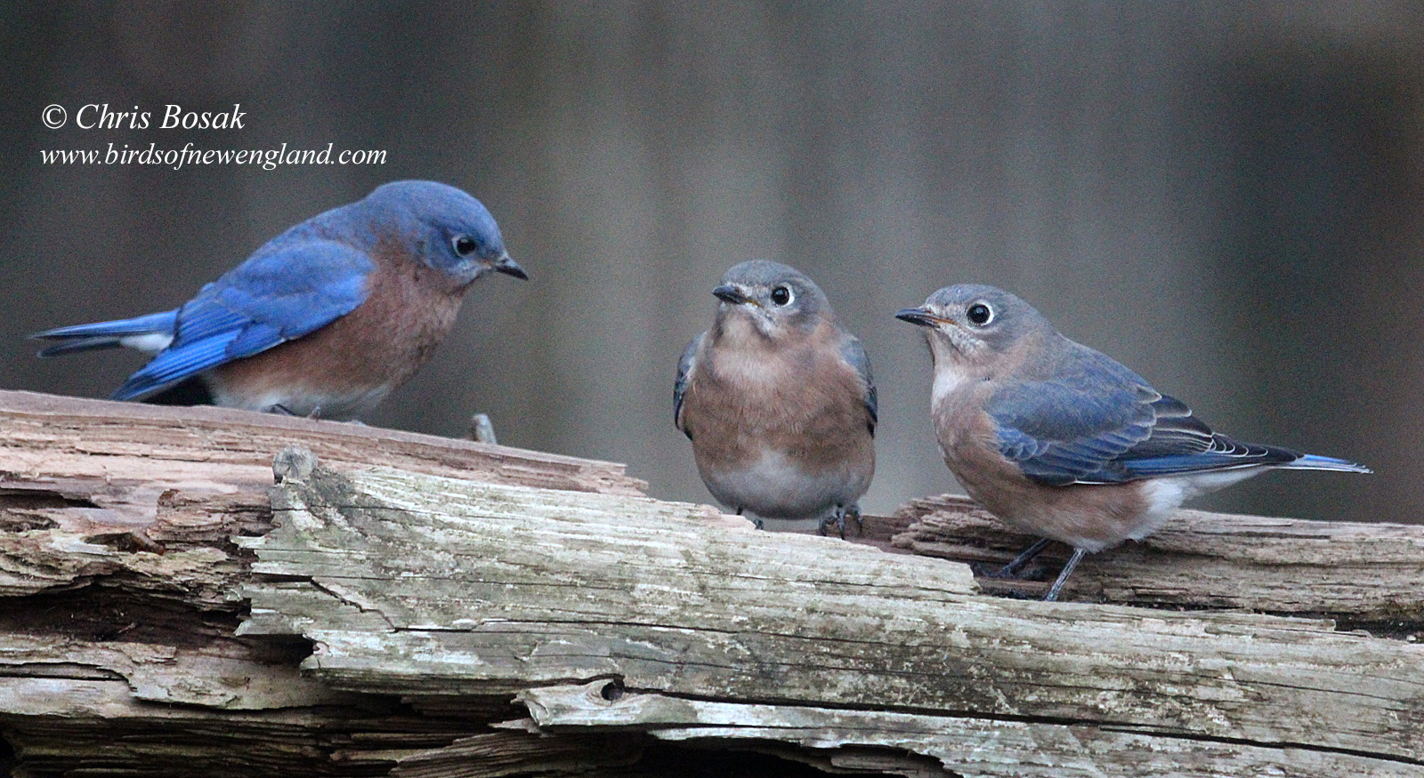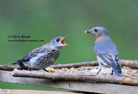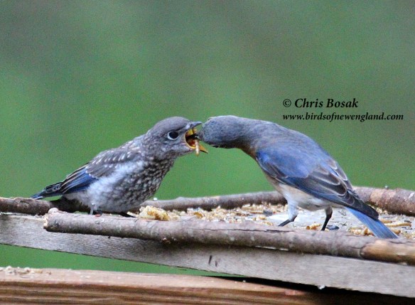 To my pleasant surprise, yesterday the pair showed up with a youngster. It is a noisy and demanding little bluebird. The parents are dutiful in feeding it. I still don’t know exactly where they nested but I’m happy to still see them every day, especially with a youngster in tow. I’ve also seen them in the woods behind my house catching natural prey so, thankfully, they are not relying solely on my mealworm handouts. It’s also nice to see that it is indeed a bluebird youngster and not a cowbird as I’ve seen plenty of those around this spring.
