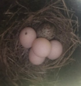 But the news isn’t all good. Only four of the eggs are white phoebe eggs. A darker, mottled egg of a brown-headed cowbird is also in the nest.