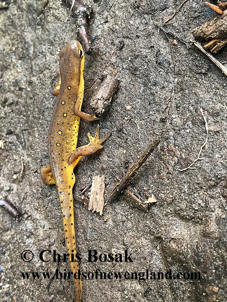 If you’ve spent any time in the New England woods in the spring, summer or fall after a rain, you’ve certainly come across an eft or two (probably way more than that.) They wander onto hiking trails and can be quite numerous the day after a rain. I came across several during a recent walk at Huntington State Park in SW Connecticut. Notice the different colors of the two efts pictured. The eft is the terrestrial stage of the eastern newt. The four stages of the newt are described succinctly in the following post by author David George Haskell.