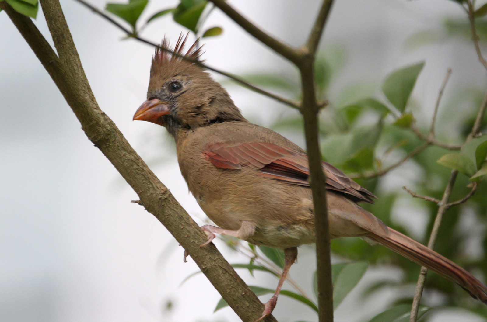 Photo by Chris Bosak – An immature cardinal perches in a bush next to a feeder.