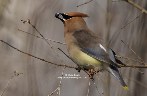A cedar waxwing eats border privet berries in New England, February 2025.