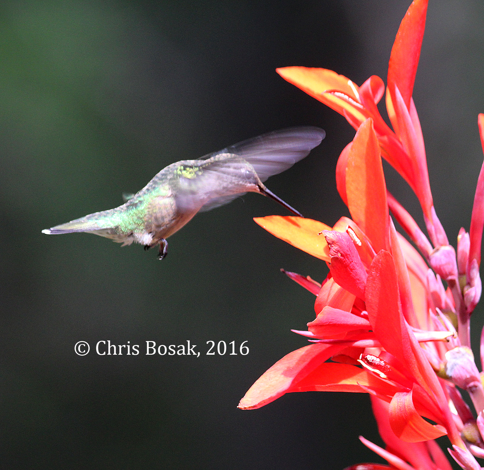 A female Ruby-throated Hummingbird takes off from a perch in Norwalk, Conn., summer 2014.