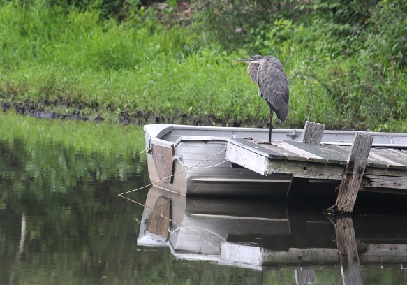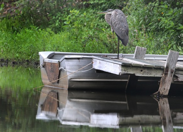A great blue heron stands on a dock at Lake Waubeeka in Danbury, Conn., during the summer of 2017.