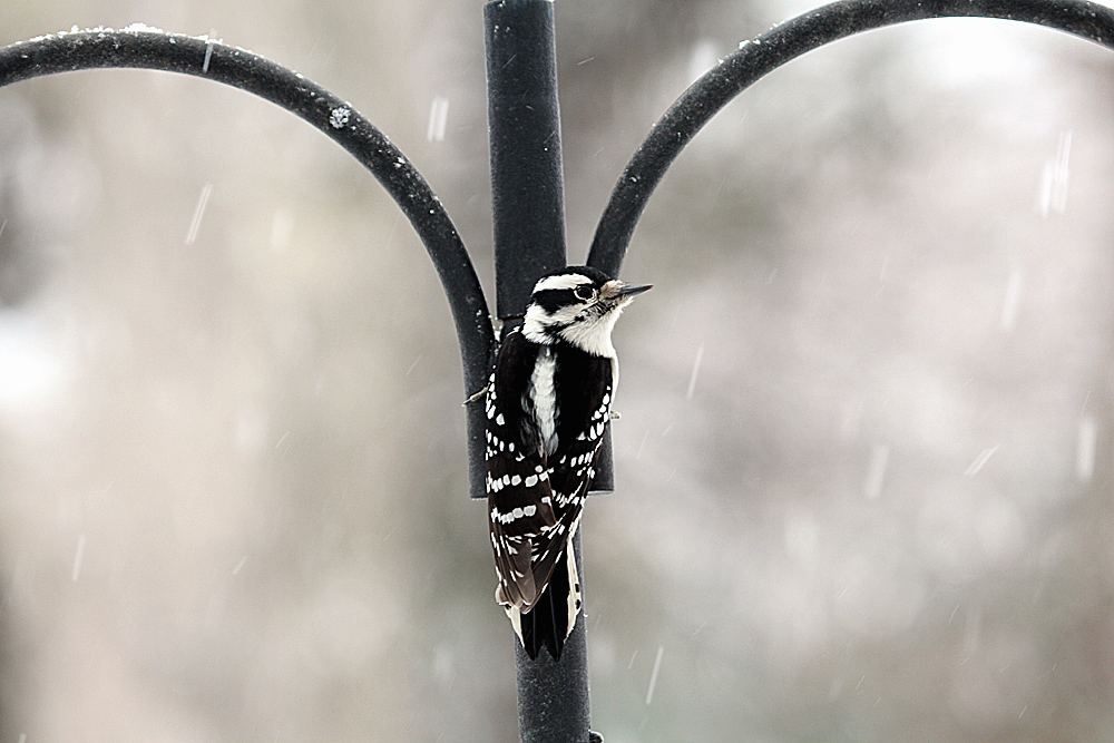 A female downy woodpecker perches on a birdfeeder stand before heading to the suet feeder during the Dec. 14, 2013, snow fall.