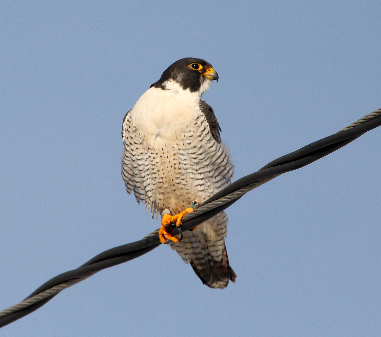 A Peregrine Falcon rests on the top of a sailboat mast during a frigid day in Feb. 2015.