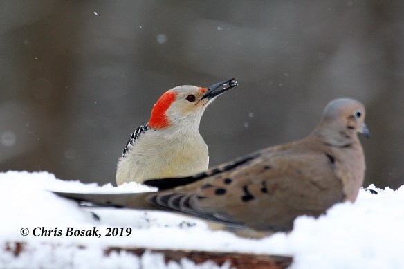 Now the Blue Jays have competition. A male Red-bellied Woodpecker discovered the peanut station and visits daily to take as many peanuts as I’ll put out there.