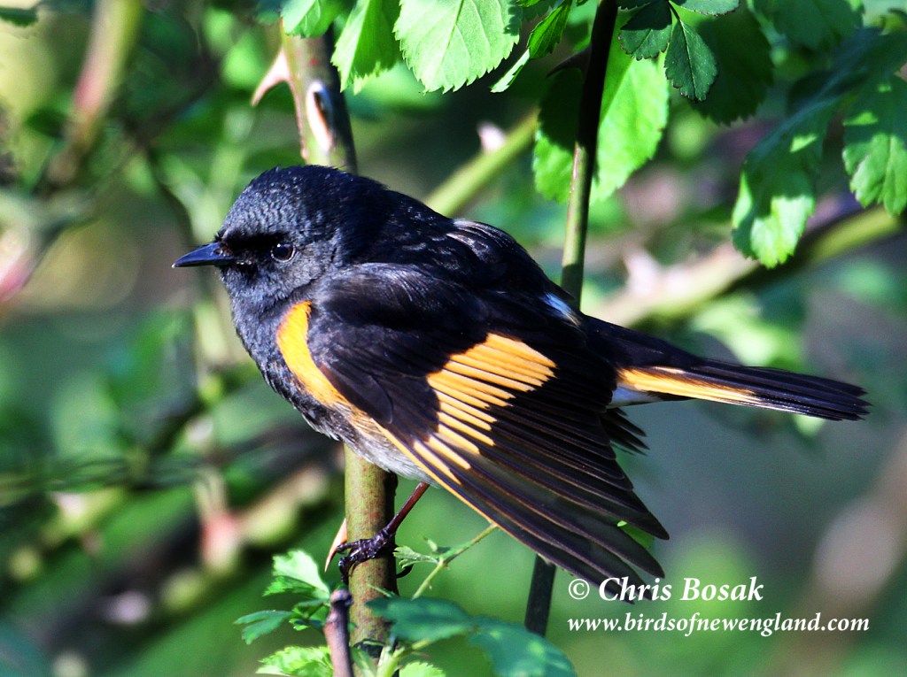 Photo by Chris Bosak An American redstart perches in a bush at Bennett’s Farm State Park in Connecticut, May 2020.Photo by Chris Bosak