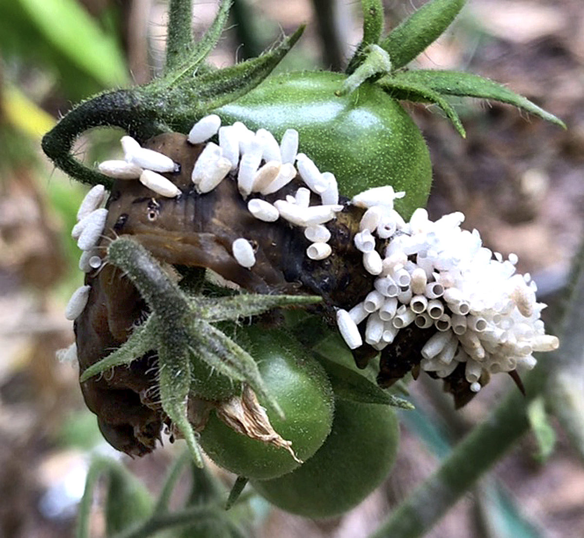 tomato hornworm3 Published September 28, 2020 at 1200 × 1104 in tomato hornworm3 Photo by Chris Bosak Wasp larva decimate a tomato hornworm in a garden in New England, September 2020.